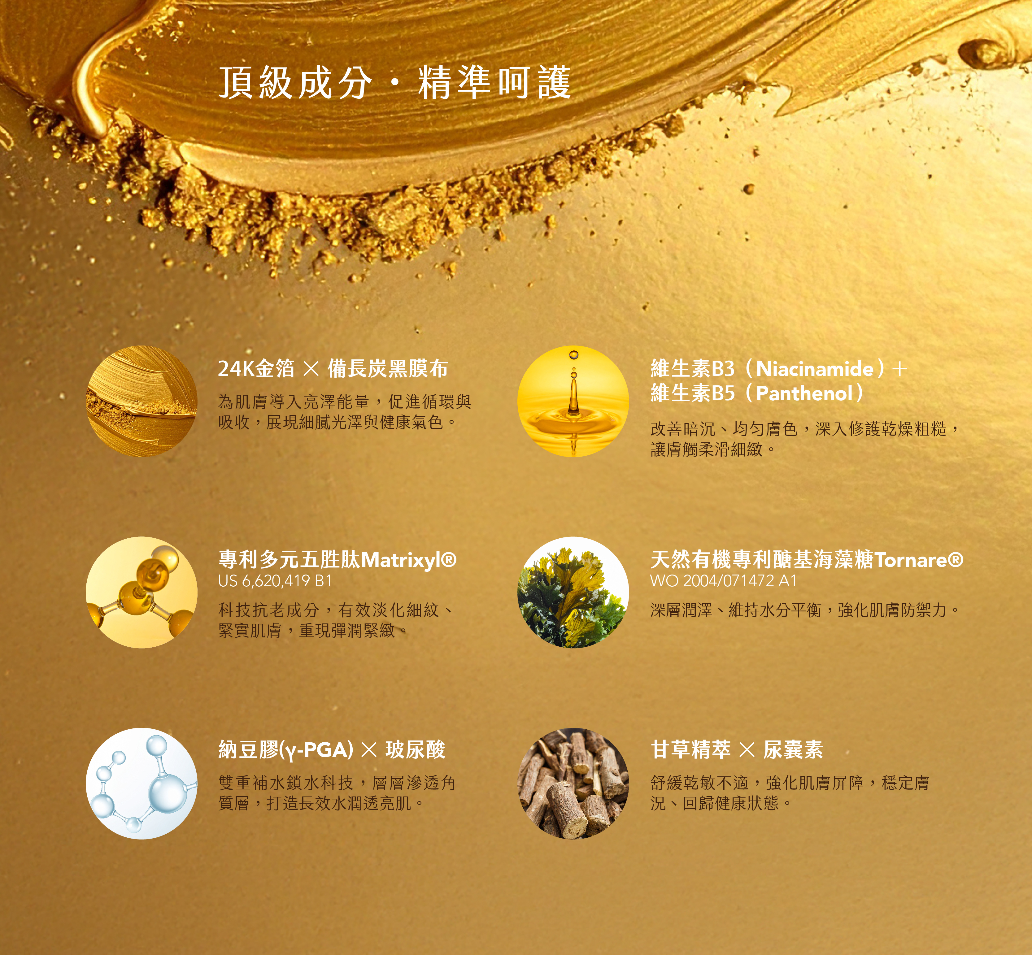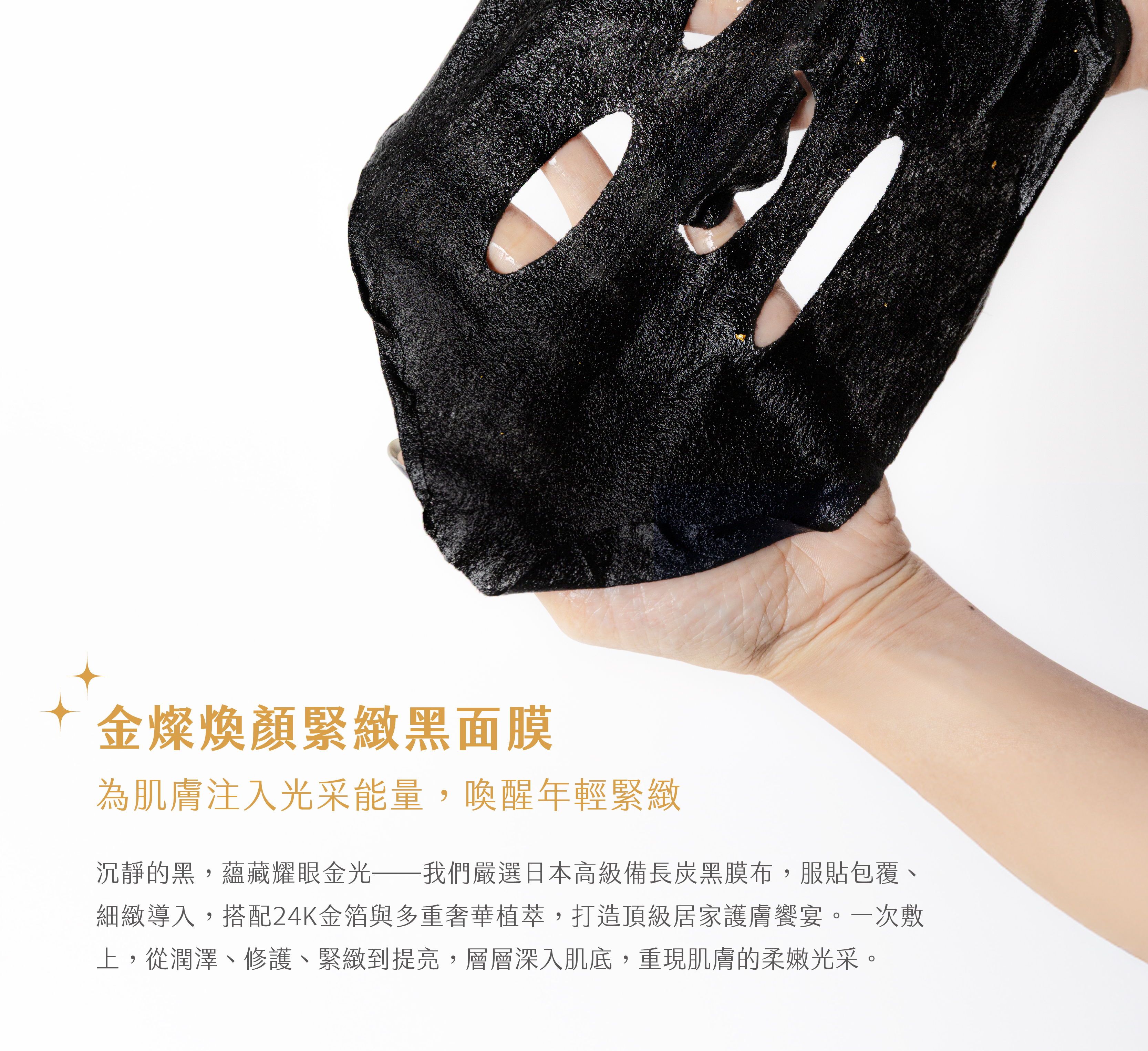 我們嚴選高級備長炭黑膜布,服貼包覆、細緻導入,搭配24K金箔與多重奢華植萃,打造頂級居家護膚饗宴。