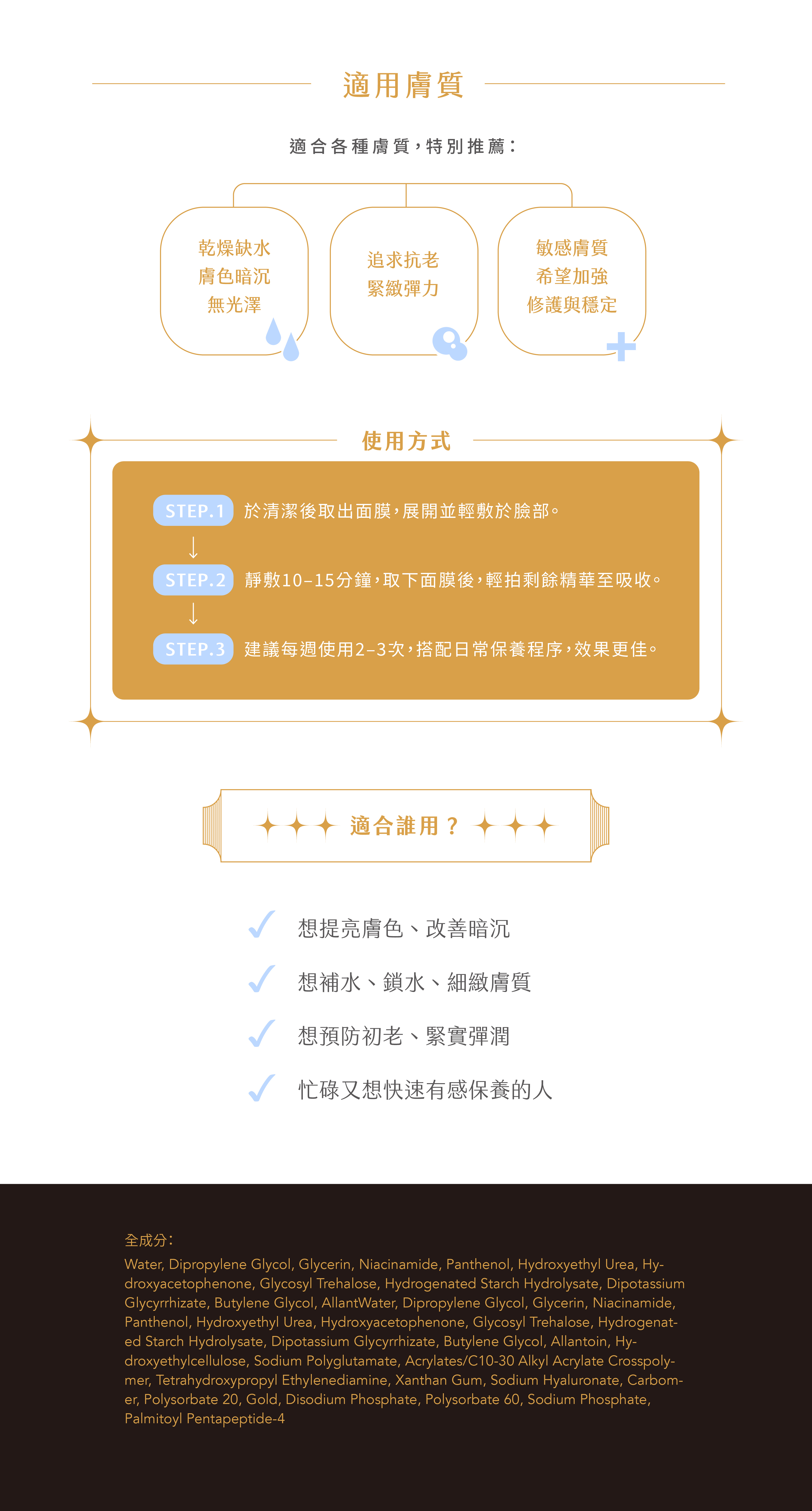 一次敷上,從潤澤、修護、緊緻到提亮,層層深入肌底,重現肌膚的柔嫩光采。